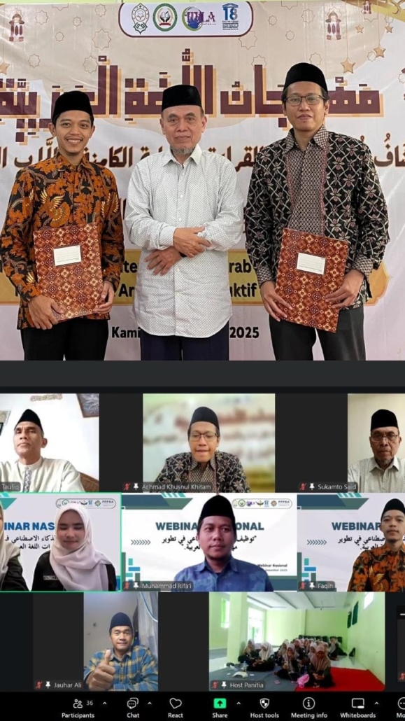 التوظيف الذكاء الاصطناعي في تطوير مهارات اللغة العربية Pemanfaatan Kecerdasan Buatan dalam Pengembangan Keterampilan Bahasa Arab). Acara ini menghadirkan tiga narasumber yang aktif di bidang pendidikan dan kebahasaan, yaitu Jauhar Ali, S.Pd.I., M.Pd.I., Dr. H. Muhammad Taufiq, M.A., dan Achmad Khusnul Khitam, M.Hum., dengan moderator Faqih Ahmad, Lc., M.H. Kegiatan berlangsung secara daring melalui Zoom dan diikuti oleh peserta.